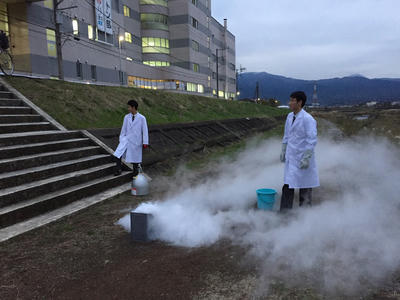 予定していた実験は、お湯の中に液体窒素を入れ、気体になった窒素が勢いよく上昇していくというもの。